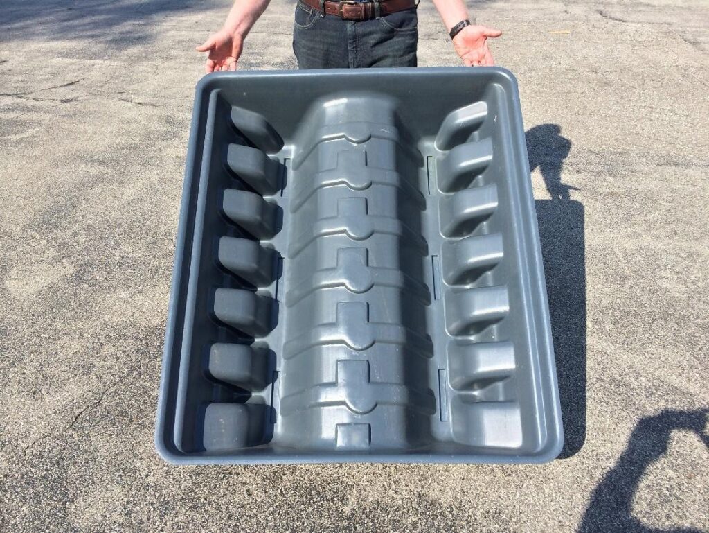 ABS .250” gauge for water jet cutting machine. Meyer Plastics design eliminated two support arms reducing part cost by $35.00.Dunnage Tray: