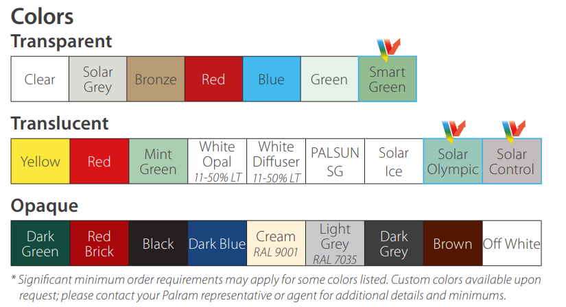 Note: Most Palsun® sheet applications use clear sheets. Gray and bronze tint are available as is white for sign applications and black for display applications. The rest of the colors require a custom run of 6000 lbs.